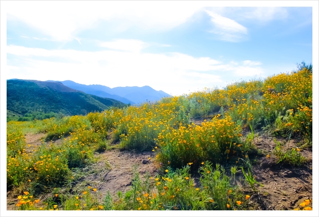 yellow poppy flower field with green leaf and blue cloudy sky in summer