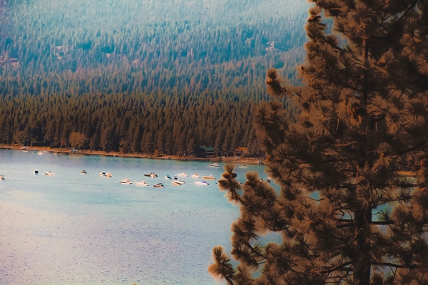 pine tree and boats on the water at Lake Tahoe Nevada USA