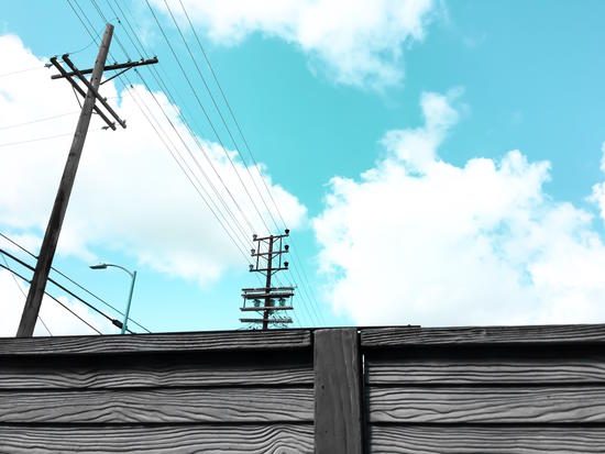 › Electric pole with wooden wall and blue cloudy sky in the city