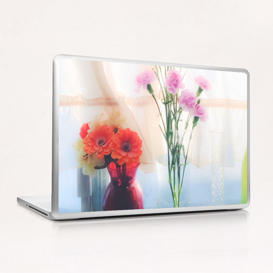 pink flower and orange flower in the vase with curtain background